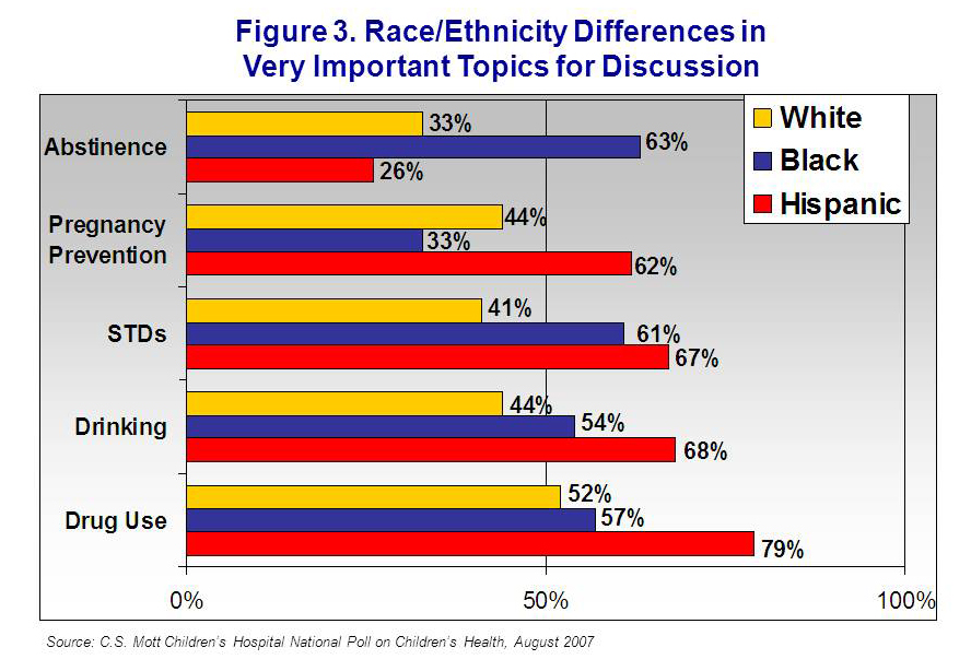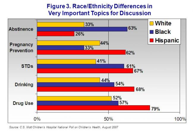 Health topics that did not make the top ten list for all parents include: pregnancy prevention, relationships with family/friends, safety, sexual abstinence, school performance, violence, bullying and religion/faith. However, differences in top topics to discuss were seen by race/ethnicity.