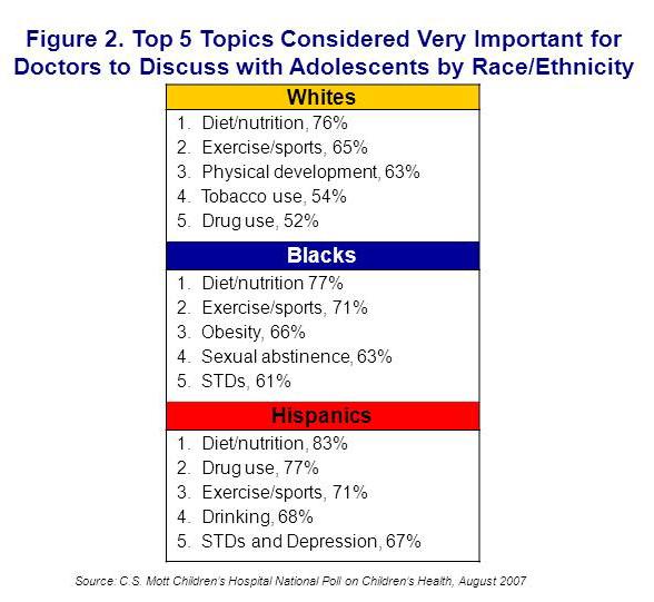 Drug abuse was 2nd on the list for Hispanics, with 77% of parents rating it as very important to discuss. Having doctors discuss obesity was rated 3rd among blacks, with 66% of parents indicating it as a very important topic (Figure 2).