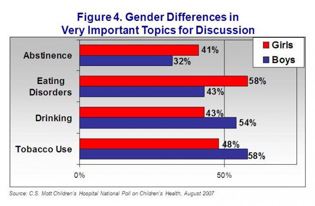 In the eyes of parents, there were several topics that had differing levels of importance based on the child’s gender. Parents of adolescent boys more frequently rated drinking and tobacco use as very important topics to discuss than parents of adolescent girls. In contrast, parents of girls more commonly cited sexual abstinence and eating disorders as very important topics for discussion (Figure 4).