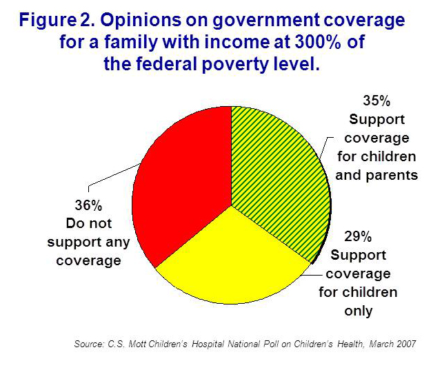 - About one-third of adults support government coverage for children and their parents in families with annual income up to 300% of the federal poverty level.