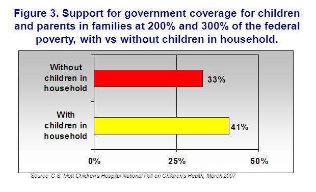 In March 2007, the C.S. Mott Children’s Hospital’s National Poll on Children’s Health surveyed a nationally representative sample of households with and without children under age 18, regarding who should qualify for government-sponsored health plans based on yearly family income in ranges served by SCHIP.