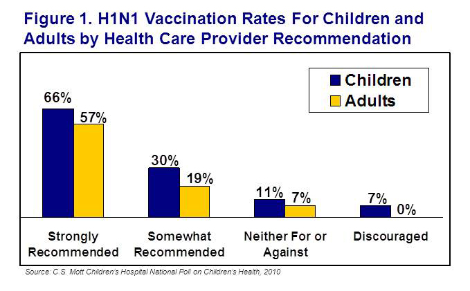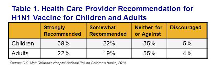 - Only 2 in 5 parents reported that their children’s providers strongly recommended H1N1 vaccine; only 1 in 5 adults reported that their own providers strongly recommended H1N1 vaccine.