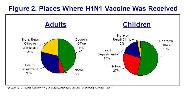 Poll results demonstrate that the efforts to expand the availability of H1N1 vaccine in different settings were successful. While a doctor’s office was still the most common vaccine site for both children and adults, more than one-quarter of children were vaccinated at school clinics, while pharmacies, retail clinics and workplace clinics accounted for 1 in 5 adult H1N1 vaccinations (Figure 2).