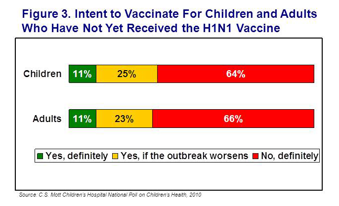 - Only 1 in 10 of those not yet vaccinated intend to get the H1N1 vaccine; another 25% would get vaccinated if the H1N1 outbreak worsens.