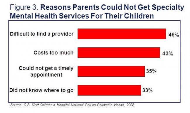 For those parents who say there has been a time when they could not get the mental health services they wanted for their children, nearly one-half said the reasons were that it was difficult to find a provider or that it costs too much, and about one-third said they could not get an appointment in a timely fashion or did not know where to go for specialty mental health services (Figure 3).