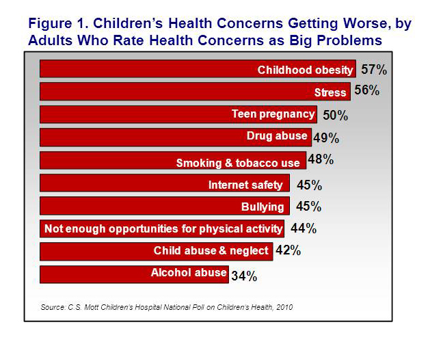 Davis MM, Singer DC, Butchart AT, Clark SJ. Obesity, stress & teen pregnancy top child health problems – getting worse. C.S. Mott Children’s Hospital National Poll on Children’s Health, University of Michigan. Vol 10, Issue 3, August 2010. Available at: http://mottpoll.org/reports-surveys/obesity-stress-teen-pregnancy-top-child-health-problems-%E2%80%94-getting-worse.