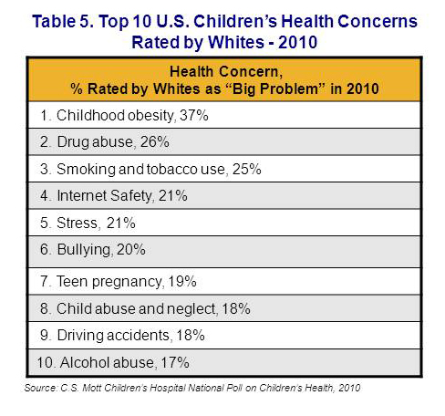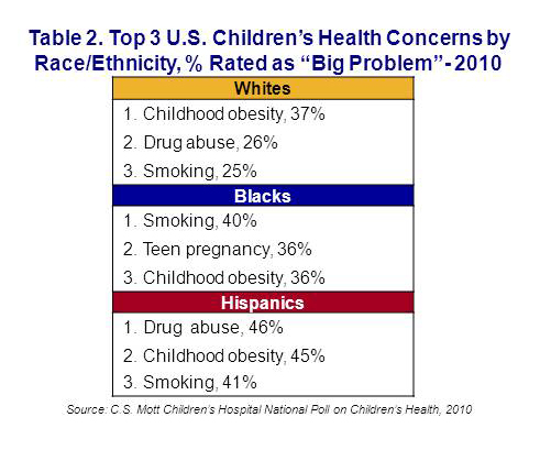 Whereas white adults rate childhood obesity as the #1 health problem for children, Hispanics rate it as #2 and black adults rate it #3. Meanwhile, smoking is rated the #1 health problem for children by blacks and drug abuse #1 by Hispanics. For the complete list of the top 10 child health concerns rated by Hispanics (Table 3), blacks (Table 4) and whites (Table 5), see page 3.