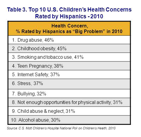 - Among Hispanic adults, drug abuse is rated as the top health problem for children.
