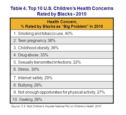 For the 4th year in a row, black adults rate teen pregnancy as one of the top health problems for children in their communities—this year as #2, at the same level of concern as obesity and slightly lower than smoking. In comparison, teen pregnancy was rated #4 by Hispanic adults and #7 by white adults, see tables on page 3.