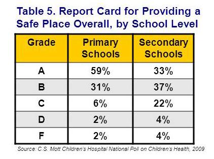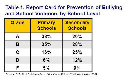 Davis MM, Singer DC, Butchart AT, Clark SJ. Parents give schools low grades for prevention of bullying and school violence. C.S. Mott Children’s Hospital National Poll on Children’s Health, University of Michigan. Vol 7, Issue 4, September 2009. Available at: http://mottpoll.org/reports-surveys/parents-give-schools-low-grades-prevention-bullying-and-school-violence.