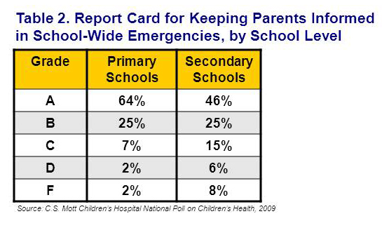Parents give primary schools the highest proportion of “A’s” for keeping parents informed in school-wide emergencies (64%). In contrast, only 46% of parents give  secondary schools an “A” for keeping parents informed (Table 2).
