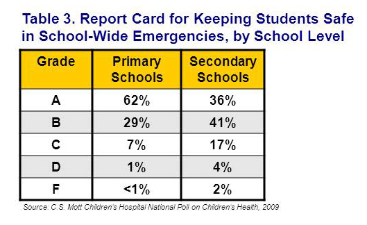 From bullying to school shootings, our nation’s schools have the responsibility to keep children safe across a wide range of situations. The CS Mott Children’s  Hospital National Poll on Children’s Health asked parents to grade their children’s schools on key aspects of school safety.