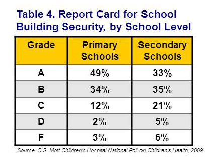 High marks are less common for building security. Only  one-third of parents give their children's secondary school an "A" grade on building security, while  about one-half of parents give primary schools an “A” (Table 4).