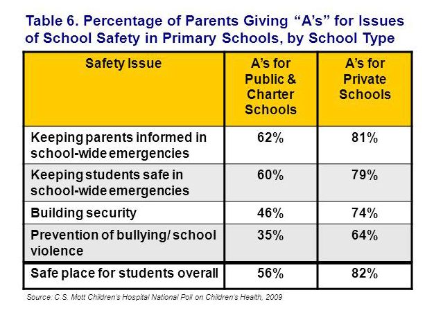 Parents of children in private schools (about 10% of children overall) give those schools substantially higher marks for safety issues than parents of children in  public or charter schools.