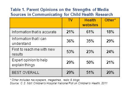 Parents disagreed about which media source does the best job in communicating child health information that is accurate, easy to understand, timely, and supported with expert opinions. About half of parents believe that health websites do the best job overall while 29% rate TV as the best overall source (Table 1)