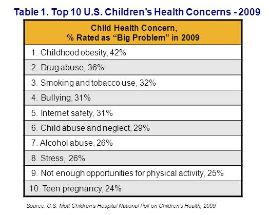 In May 2009, the Poll asked adults to rate 23 different health concerns for children living in their communities. Table 1 presents the top 10 children’s health concerns rated as a “big problem” by adults in 2009.