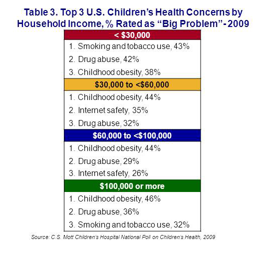 The National Poll on Children’s Health found that adults from low-income households (<$30,000 per year) rated smoking & tobacco use as the top child health concern, while the middle and highest income households ($30,000 to