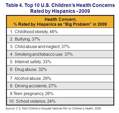 For the second year in a row, childhood obesity is the biggest health problem for children in an annual nationwide survey conducted by the C.S. Mott Children’s Hospital’s National Poll on Children’s Health. What has changed in 2009 about opinions regarding childhood obesity is that it now tops the list for Hispanics, blacks and whites. In the 2008 survey, childhood obesity was ranked 6th by Hispanics and 3rd by blacks as the biggest child health problem.
