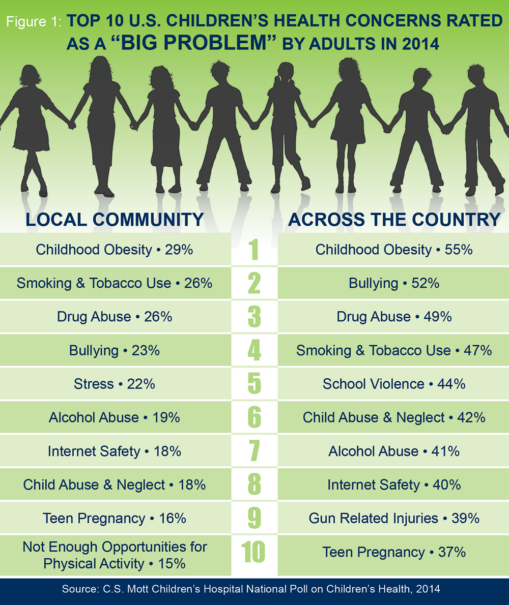 Many of the top 10 health concerns in local communities and at the national level relate to health behaviors for children and teens: childhood obesity, smoking & tobacco use, drug & alcohol abuse, bullying and teen pregnancy. Top child health concerns at the local community level this year also include stress, internet safety, child abuse & neglect, and not enough opportunities for physical activity.