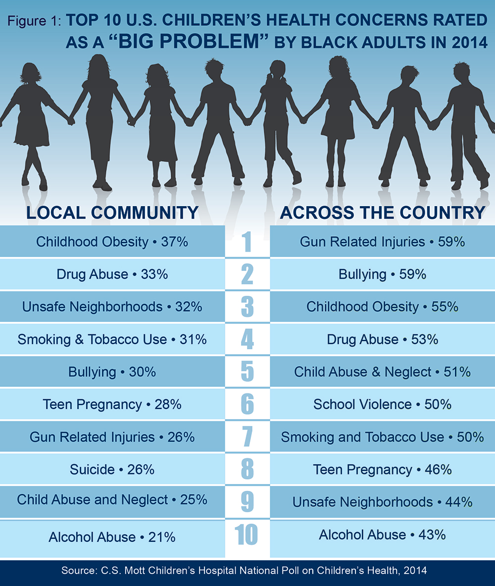 School violence and gun-related injuries were rated among the top 10 child health concerns by adults at the national level, which is a new finding in this year’s Poll.  The presence of these concerns among the top 10 nationally, but not at the local community level, may reflect broad awareness about events that have affected several schools but may not be perceived by many adults as a problem in their local communities at this time.