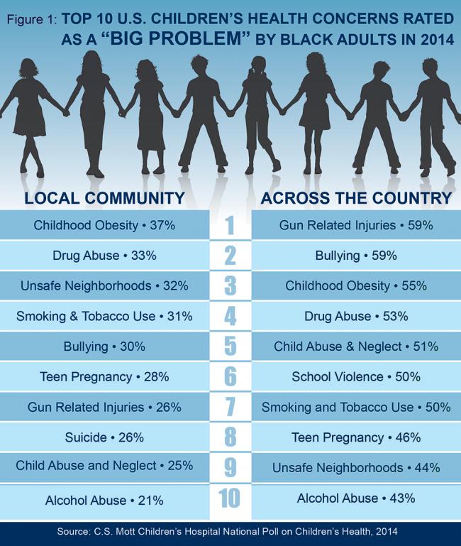 Davis MM, Kauffman AD, Singer DC, Gebremariam A, Clark SJ. School violence, gun-related injuries in top 10 child health concerns in U.S. C.S. Mott Children's Hospital National Poll on Children's Health, University of Michigan. Vol 22, Issue 1, August 2014. Available at: http://mottpoll.org/reports-surveys/school-violence-gun-related-injuries-top-10-child-health-concerns-us.