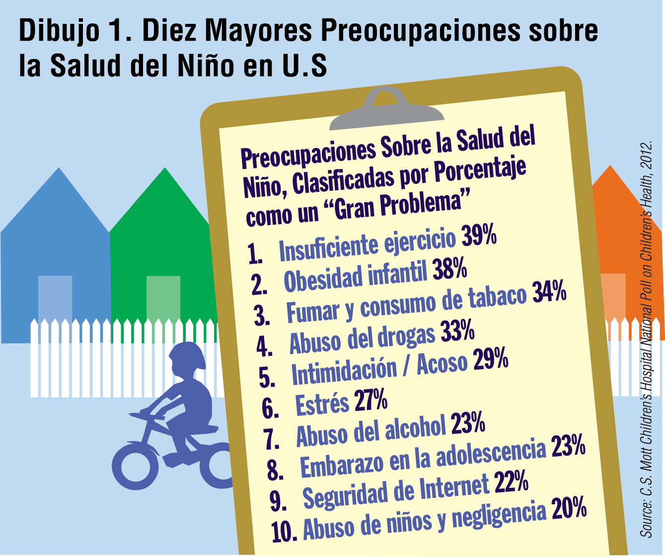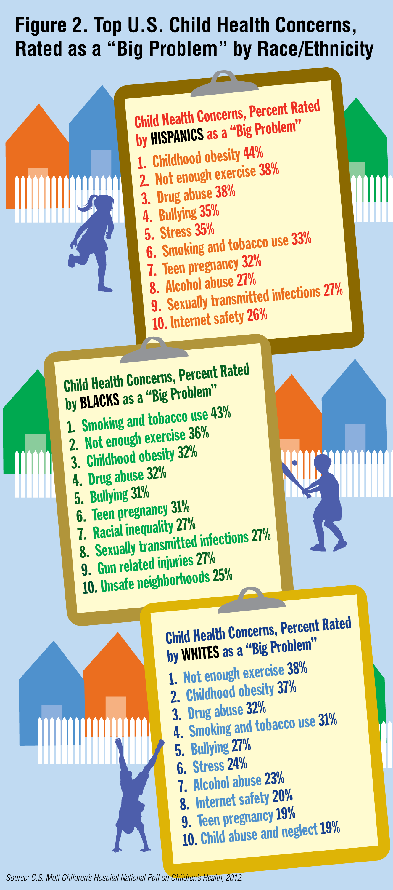 Davis MM, Singer DC, Butchart AT, Kauffman AD, Clark SJ. Top 10 child health concerns: Exercise, obesity, smoking lead list. C.S. Mott Children's Hospital National Poll on Children's Health, University of Michigan. Vol 16, Issue 3, August 2012. Available at: http://mottpoll.org/reports-surveys/top-10-child-health-concerns-exercise-obesity-smoking-lead-list.