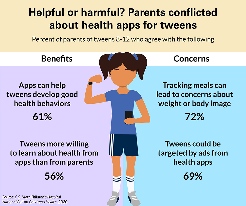The appropriateness of health apps for tweens is debatable for other reasons. Nearly three quarters of parents in this Mott Poll feel that having tweens track what they eat can lead them to become too concerned about their weight or body image. Before tweens begin using a health app that tracks food or calorie intake, parents should encourage their tween to talk about why they’re interested in tracking their food or calorie intake. Parents might consider using a similar health app for themselves, as a way to maintain a dialogue about tracking health data. This can lead to “teachable moments” that allow parents to reinforce the notion that people grow at different rates, and that being healthy does not mean the same weight or body shape for everyone.